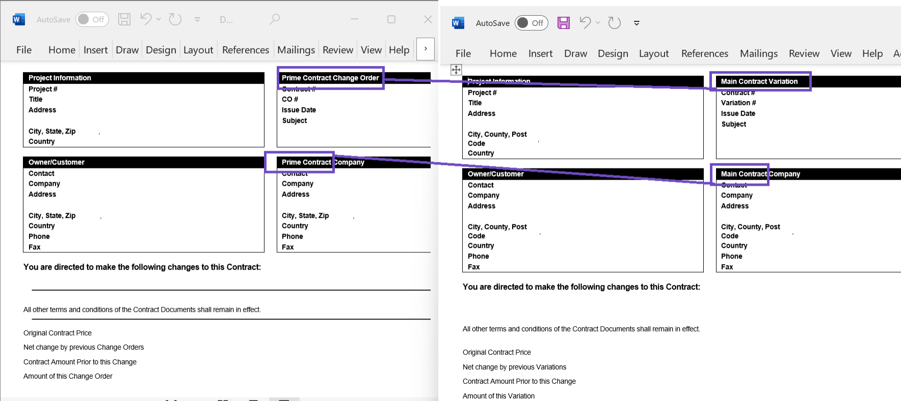 For example, the instances of "Change Order" are changed to "Variation" in the in English (United Kingdom) template file names, as well as in the templates' text when opening them in Word. Also, the instances of "Prime Contract" are changed to "Main Contract" in English (United Kingdom):