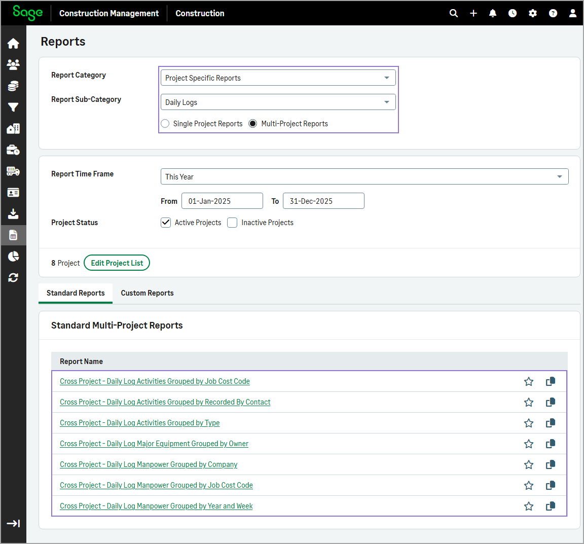 New multi-project log reports have been added under the CPRs, Daily Logs, Drawings, RFIs, Specifications, and Submittals report sub-categories.