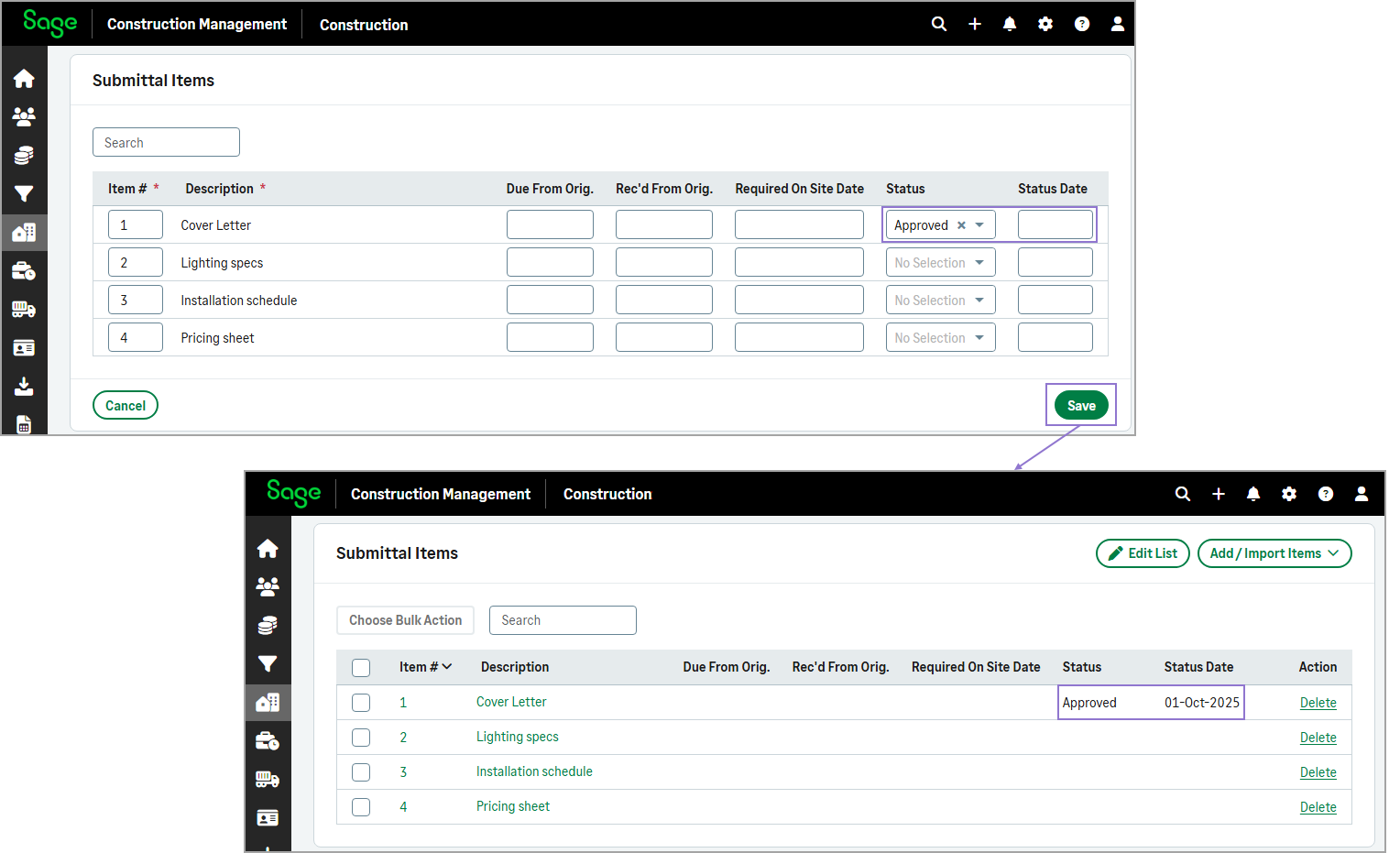 When you update a submittal item's status without setting the status date, Sage Construction Management automatically adds the date that the status was updated.