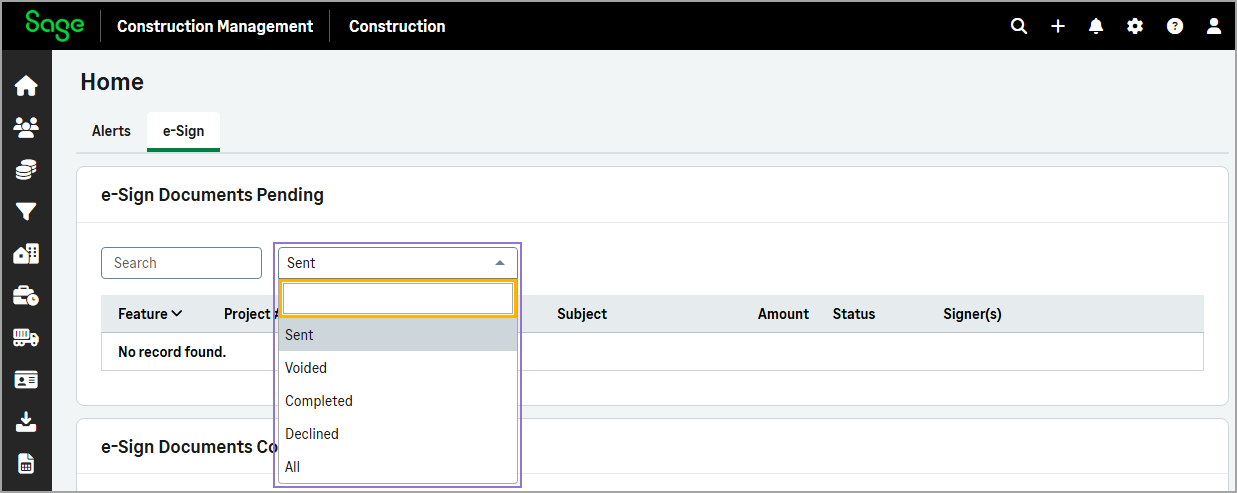 We've improved the e-Sign tab by adding a dropdown filter in the e-Sign Documents Pending section, making it easier to find documents by status.